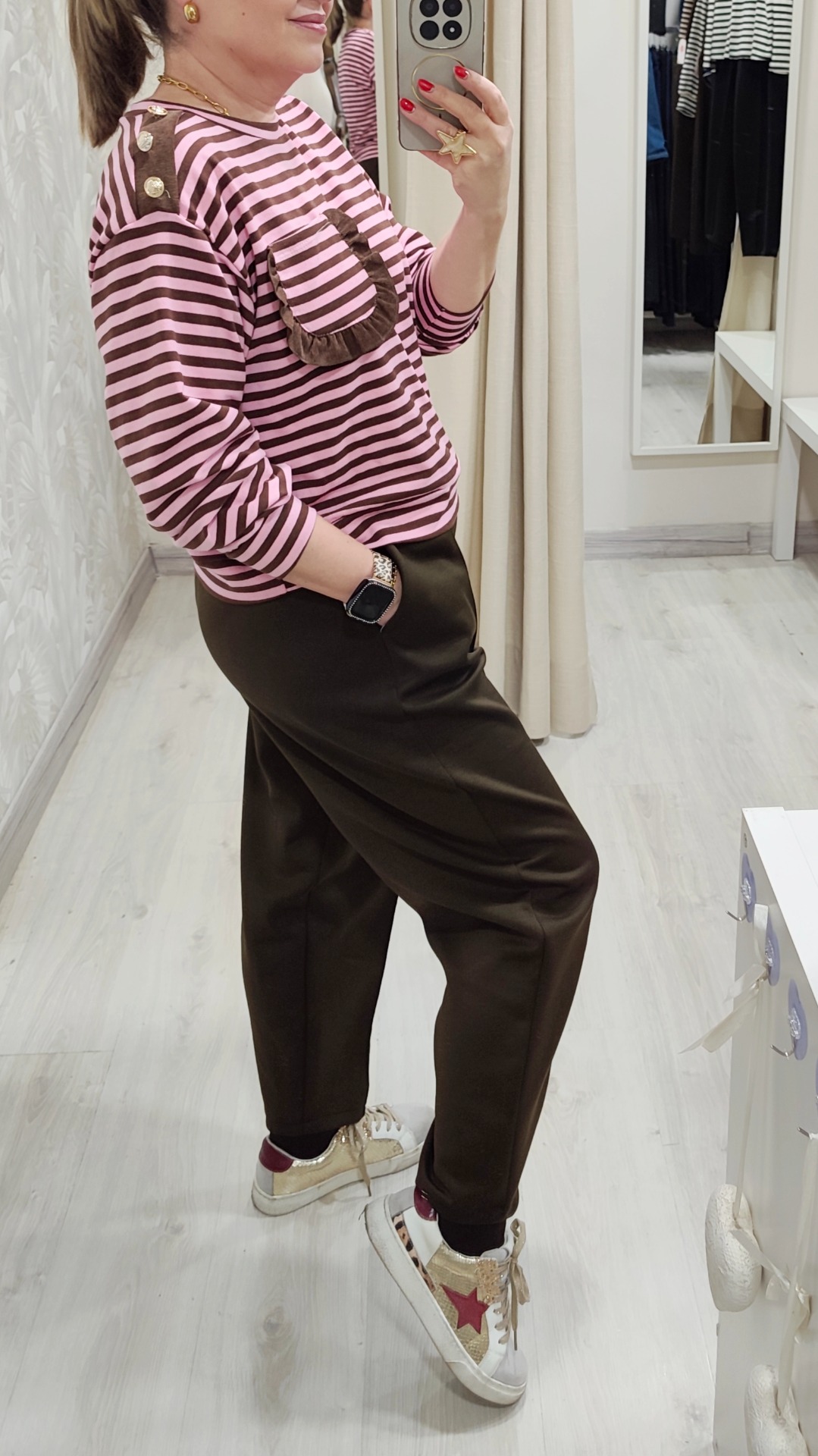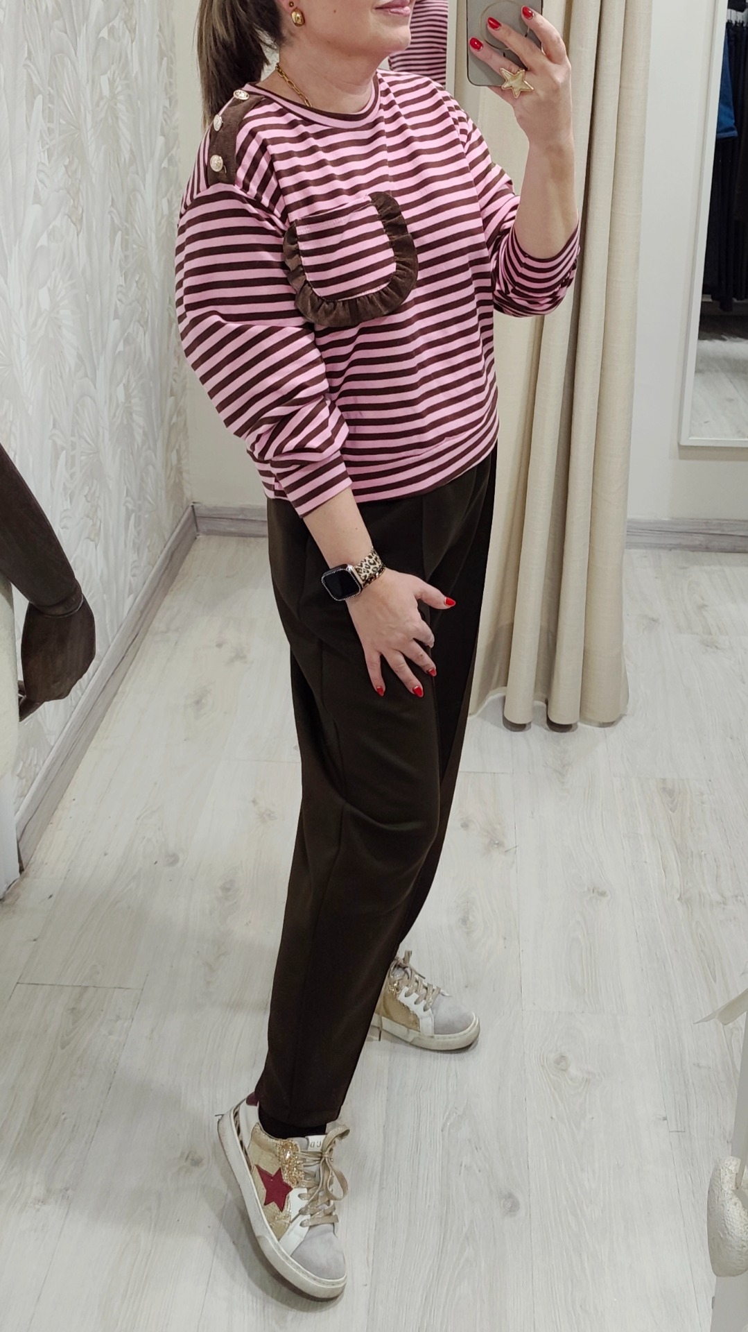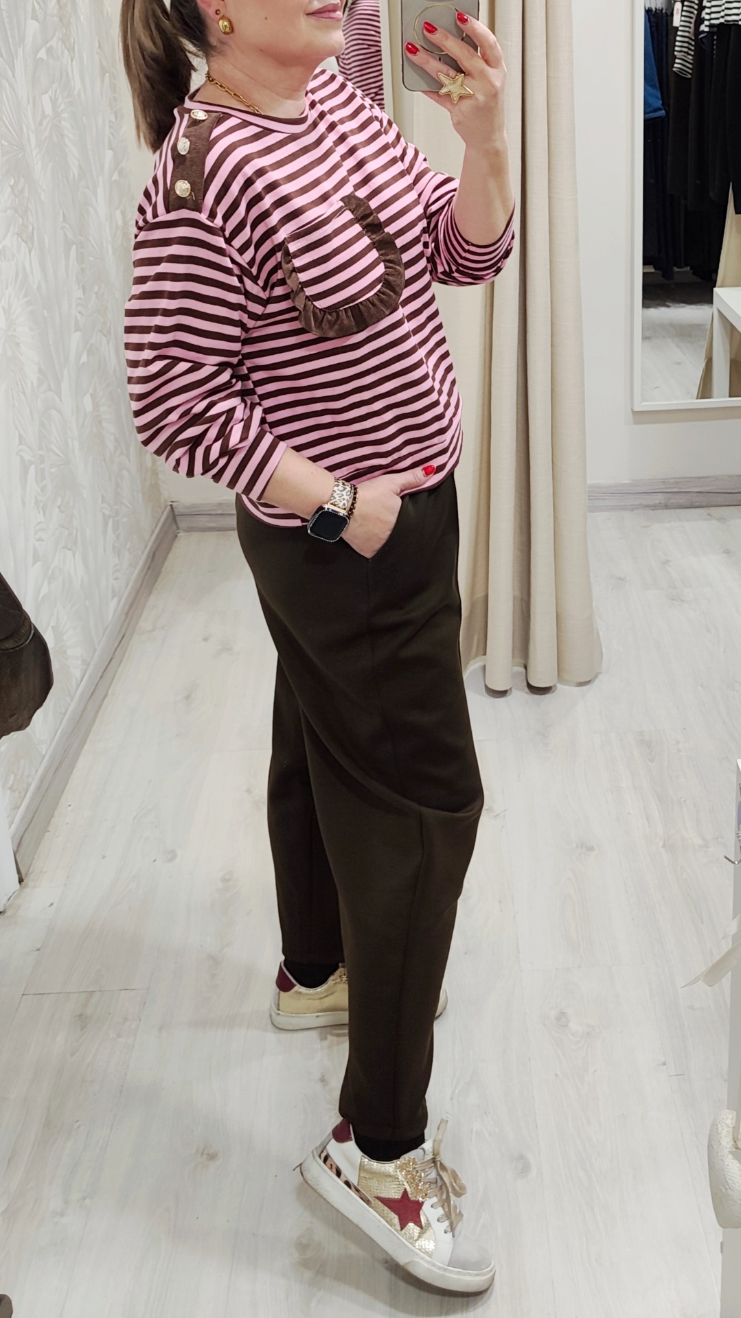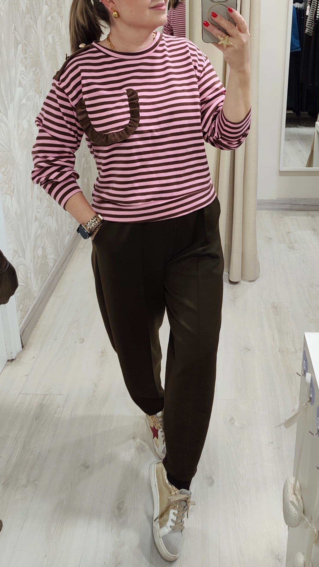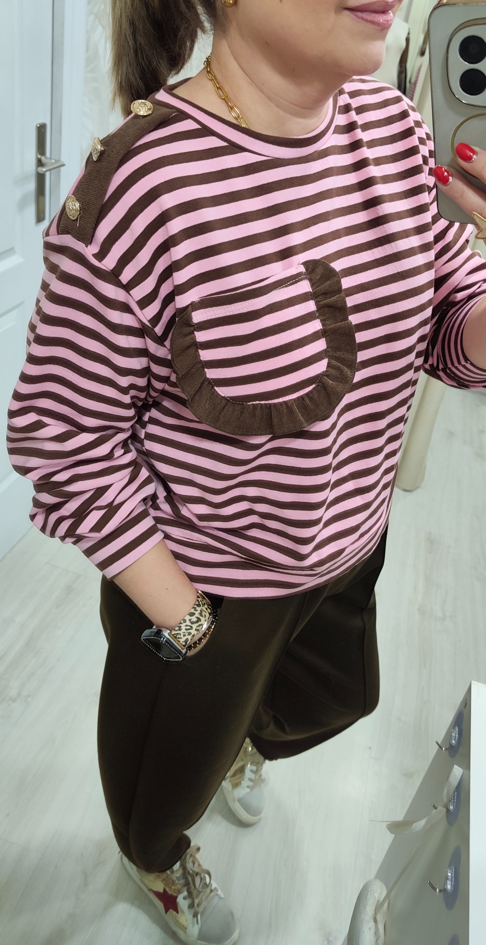 La sudadera lleva rayas rosa con detalles en chocolate.