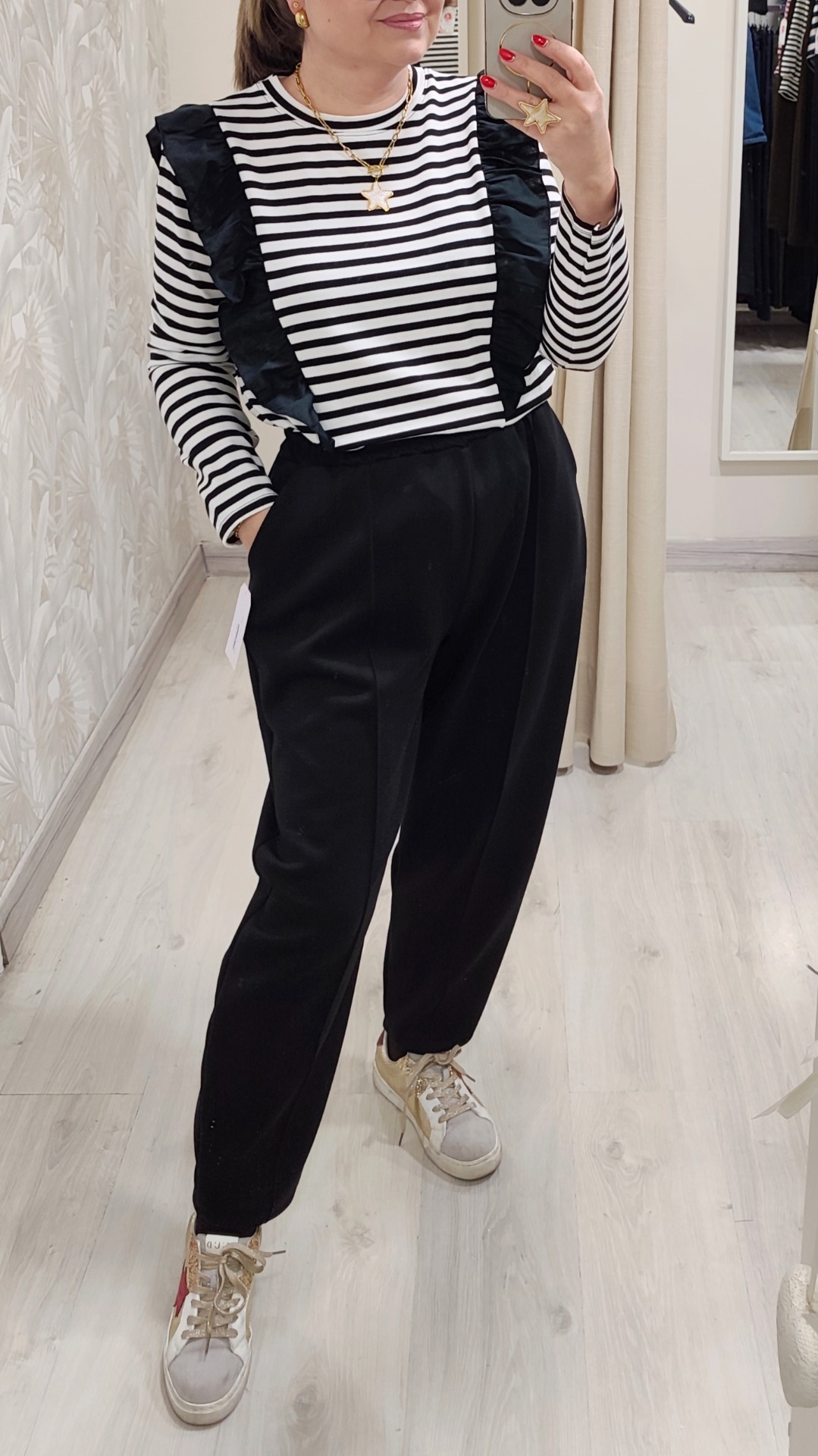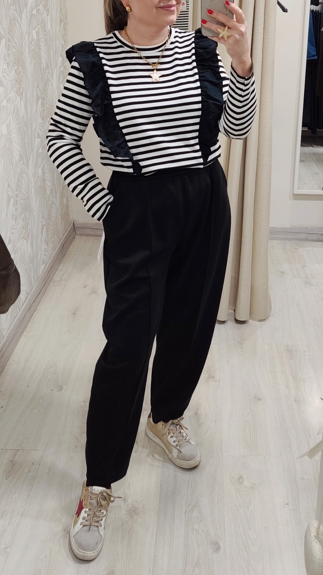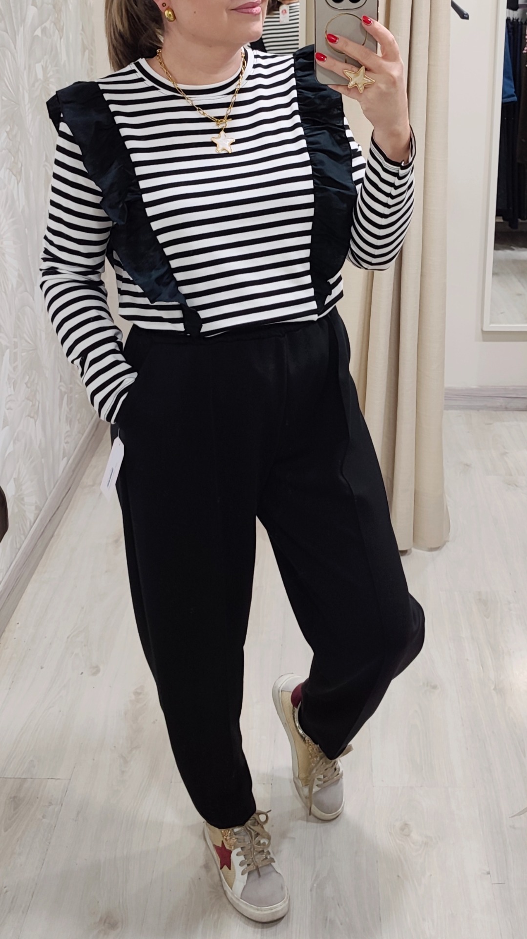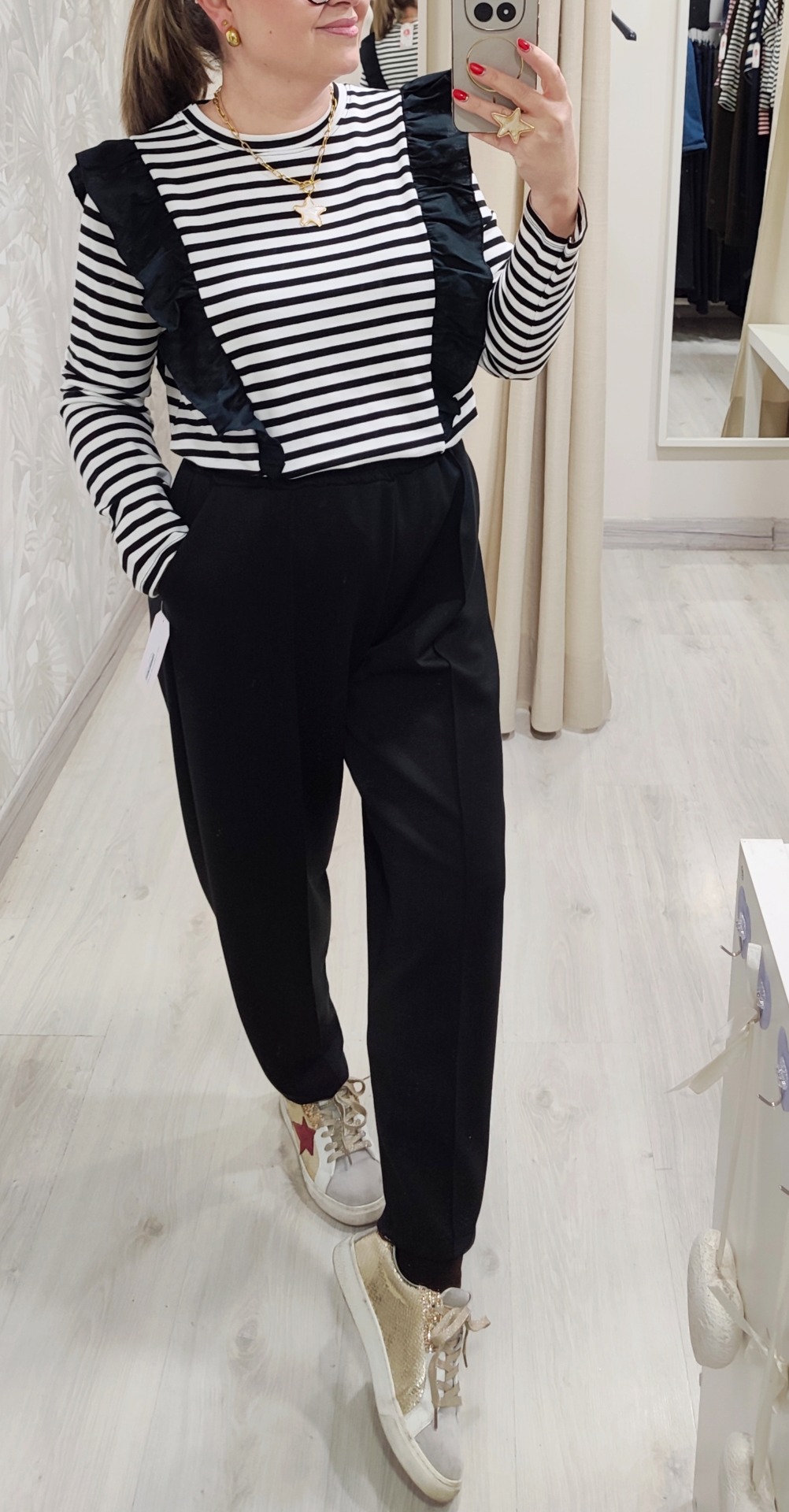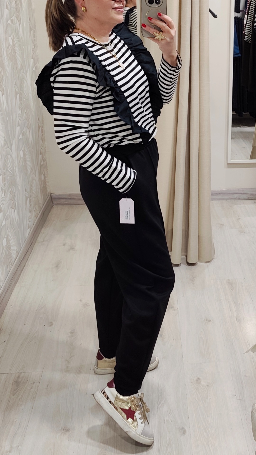 Conjunto de dos piezas, camiseta/sudadera con volante negro y rayas blanco y pantalon de pinzas tejido popcoton color negro Tipo bombacho.