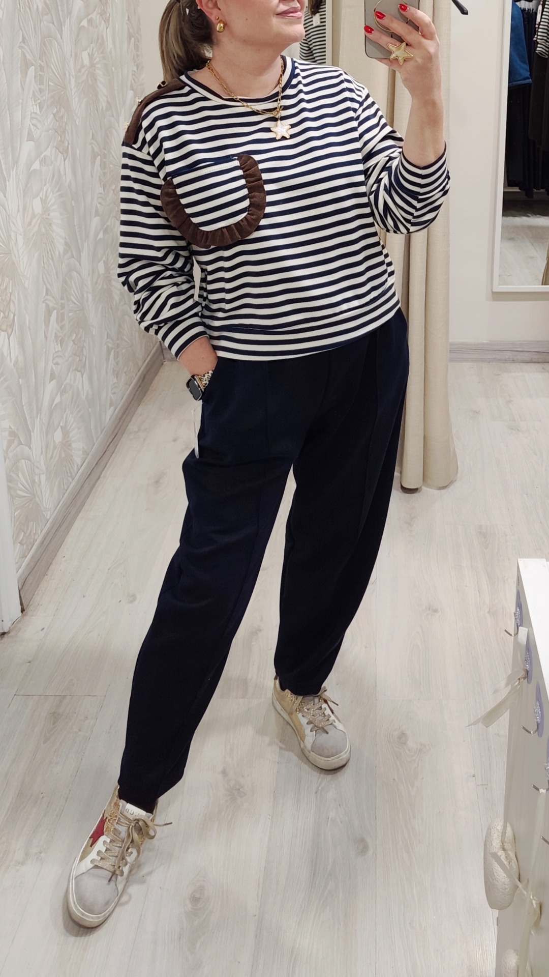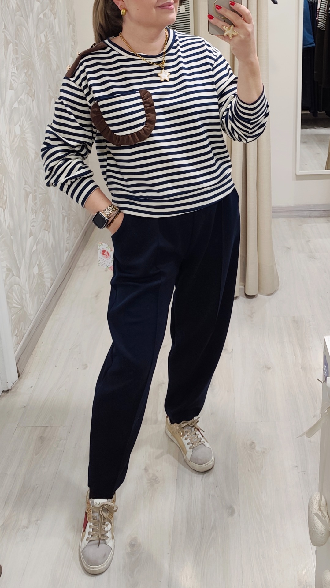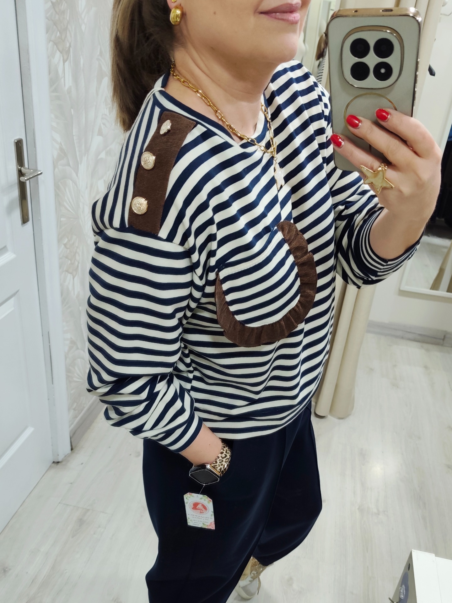 La sudadera lleva rayas marino con detalles en chocolate. 29,90€
