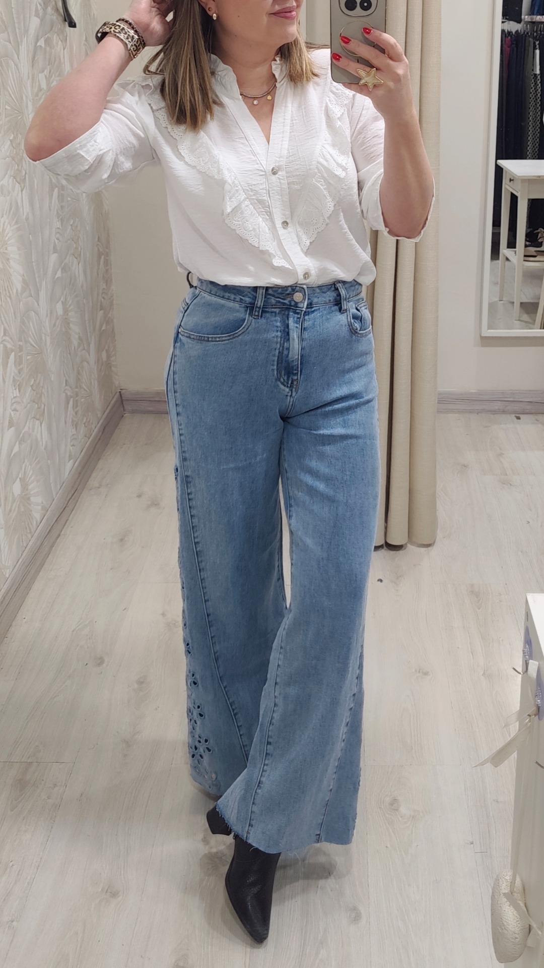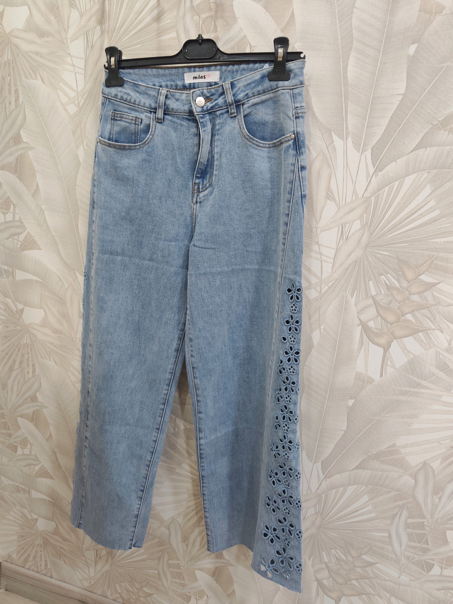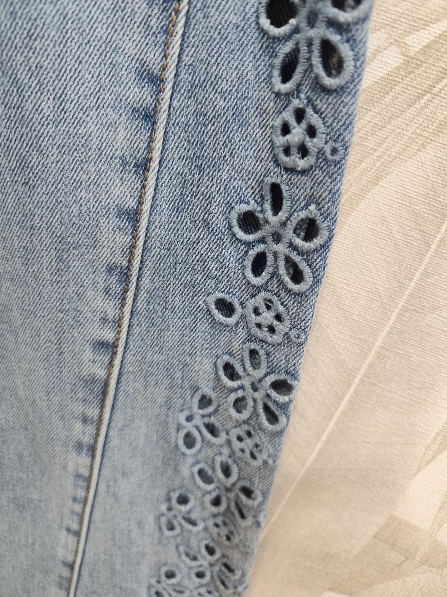 Vaquero ancho corte cadera triangular con perforaciones de batista