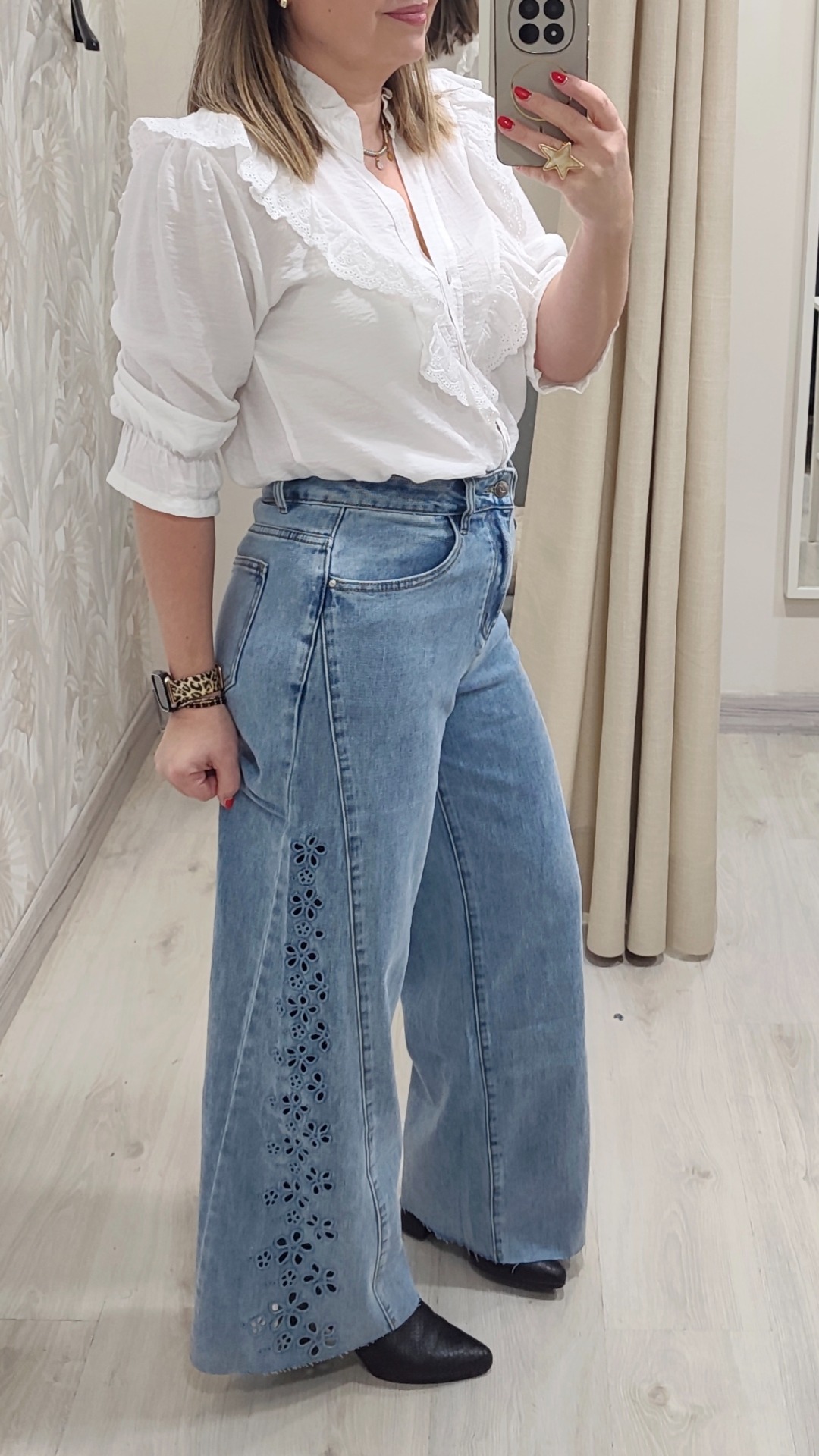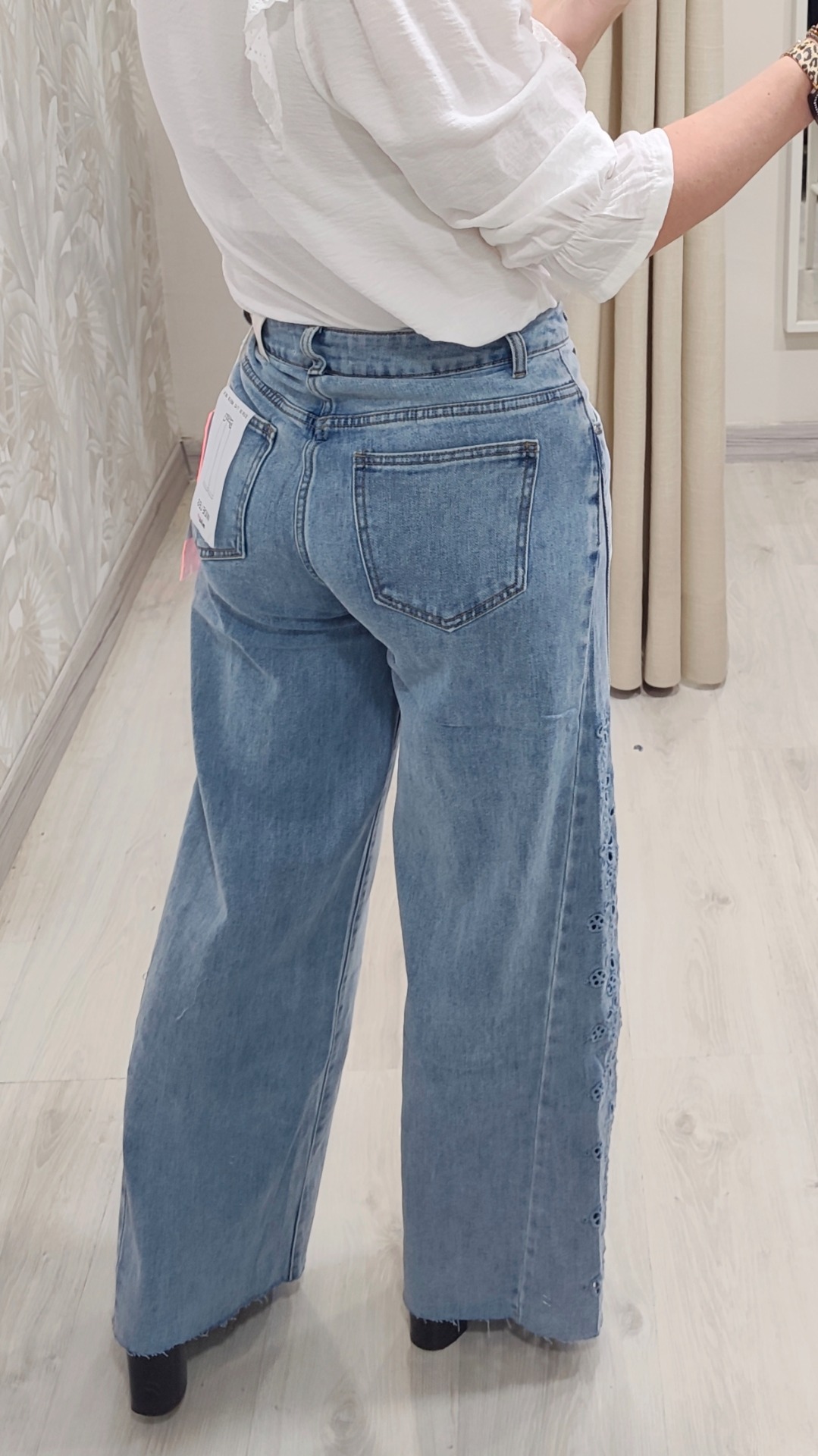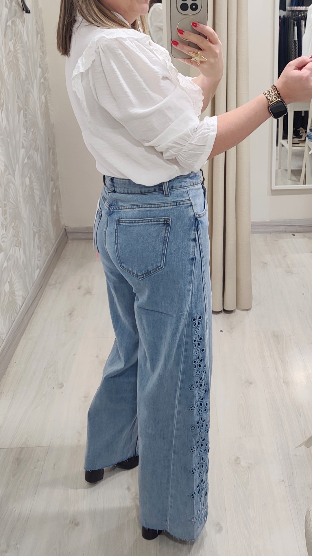 Vaquero ancho corte cadera triangular con perforaciones de batista