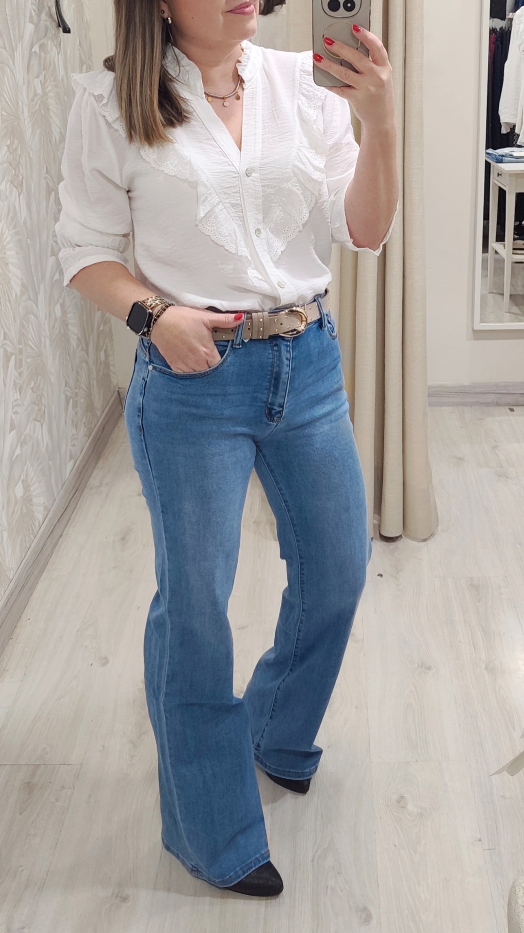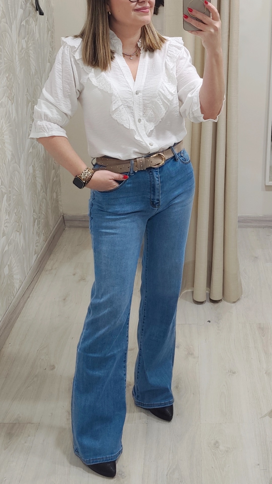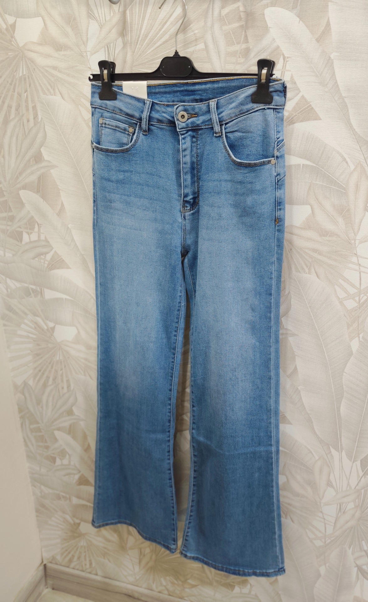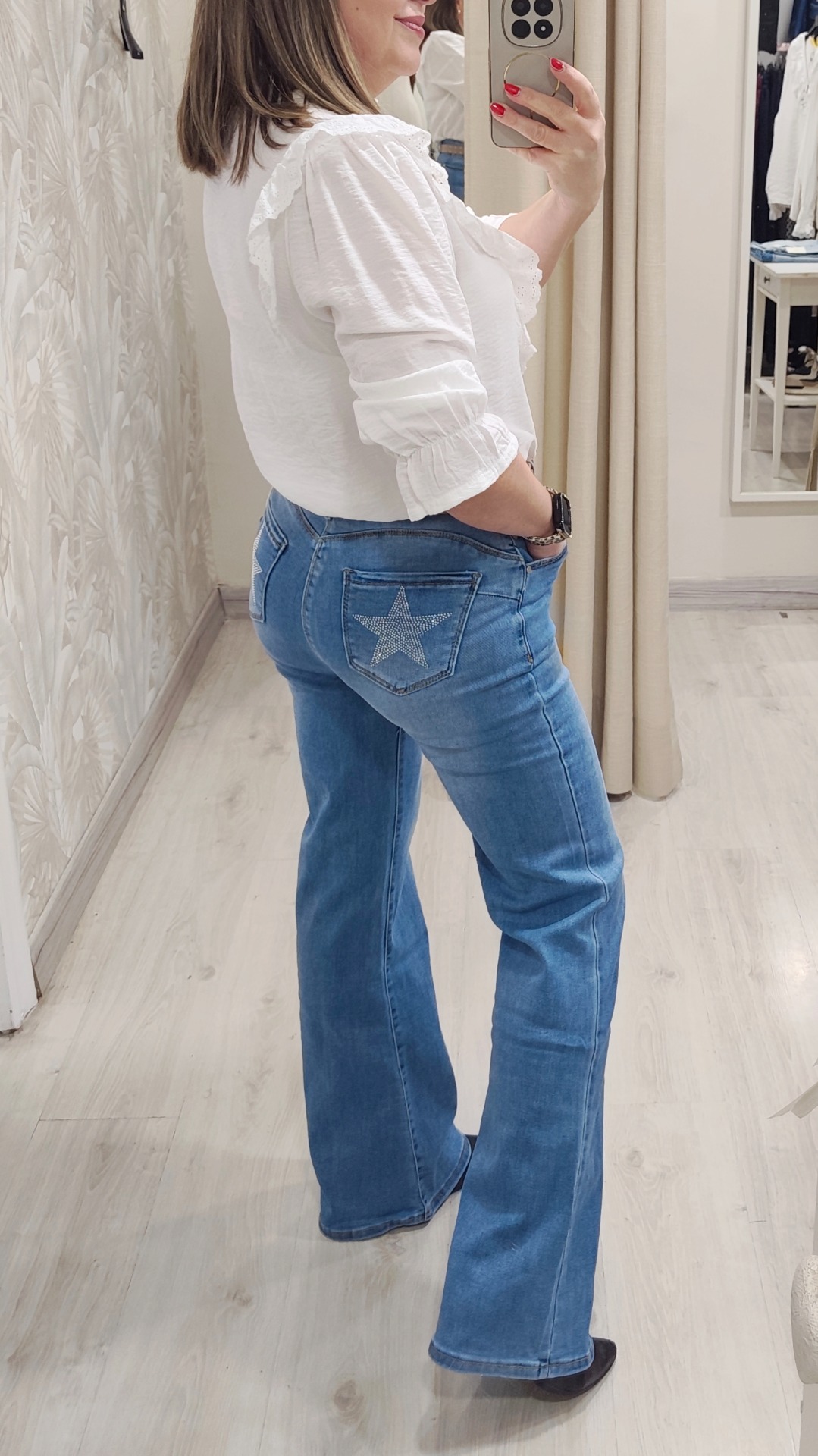 Vaquero recto ancho color azul con detalle de estrella strass en bolsillo trasero.