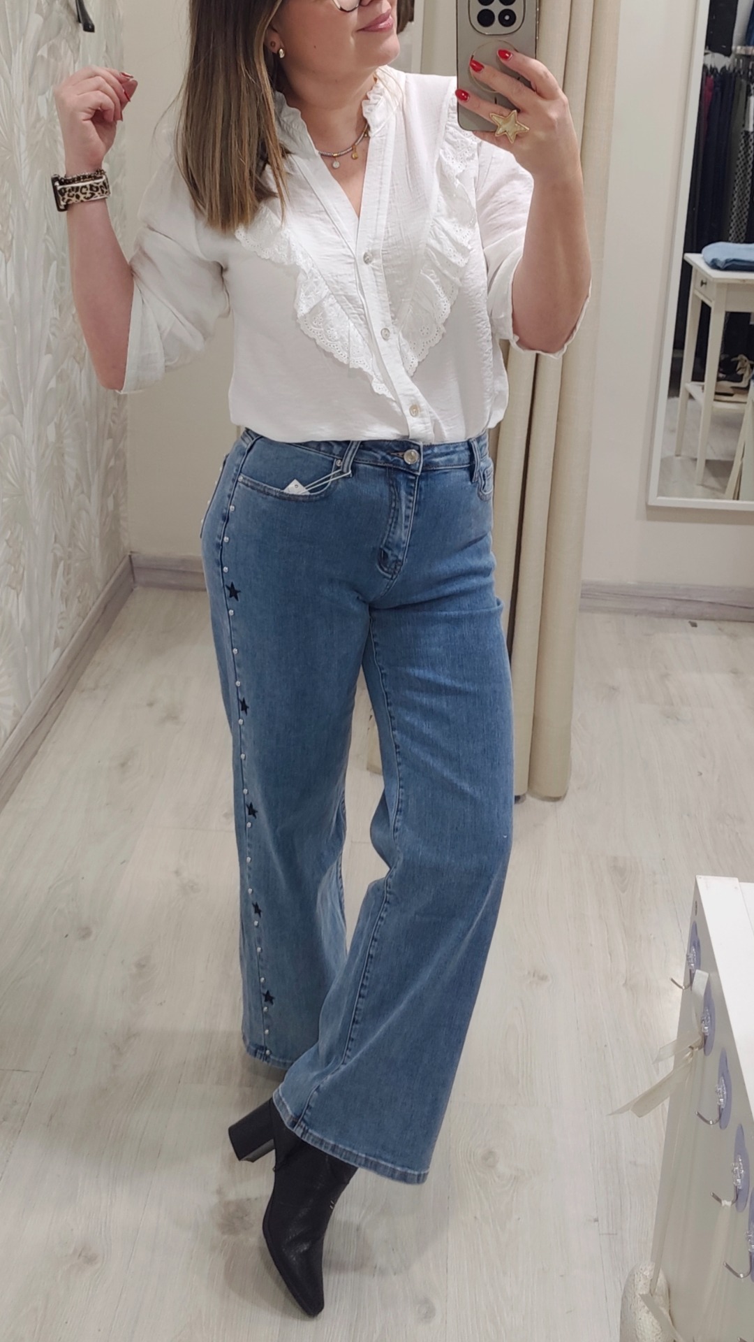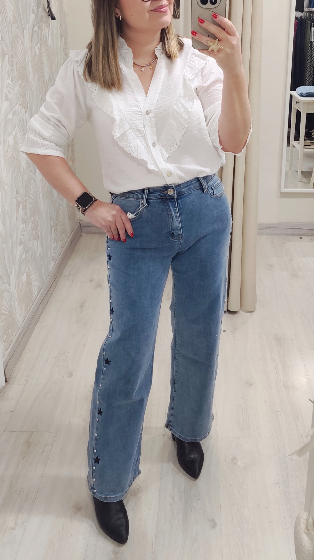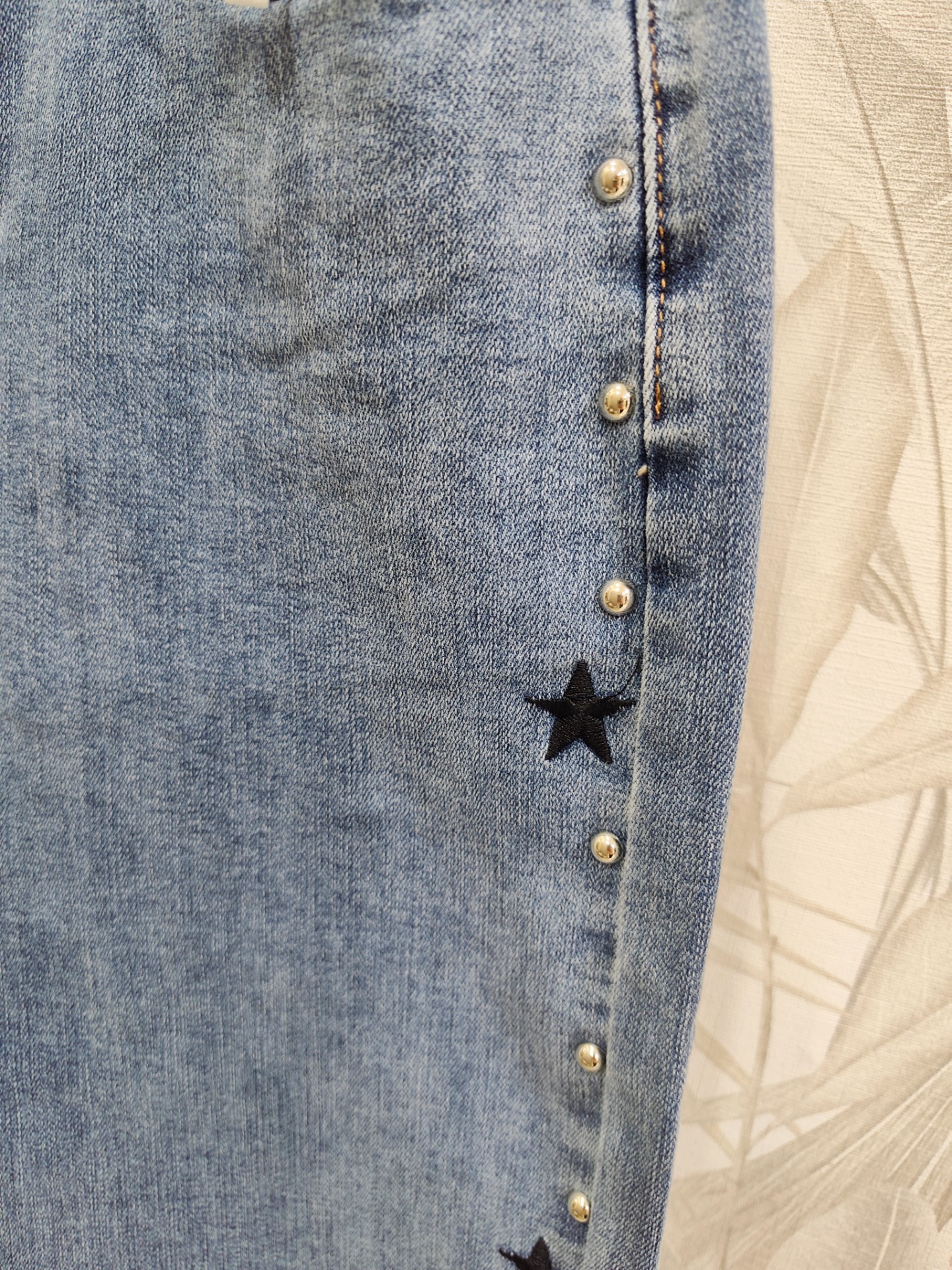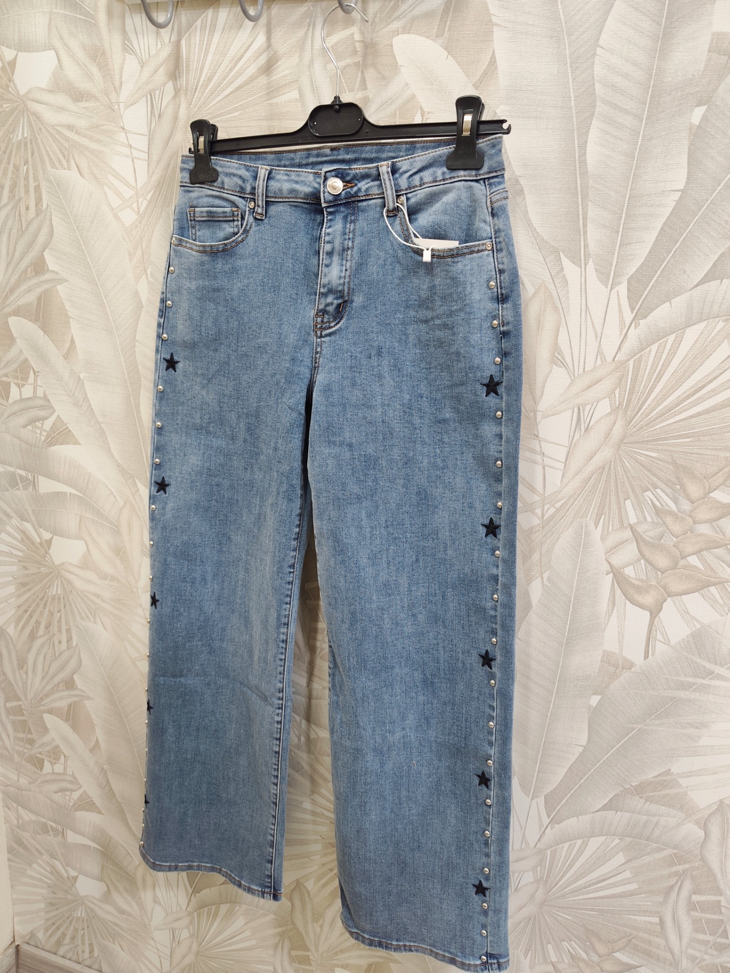 Vaquero corte recto con detalles en linea lateral de estrellas bordadas y tachuelas
