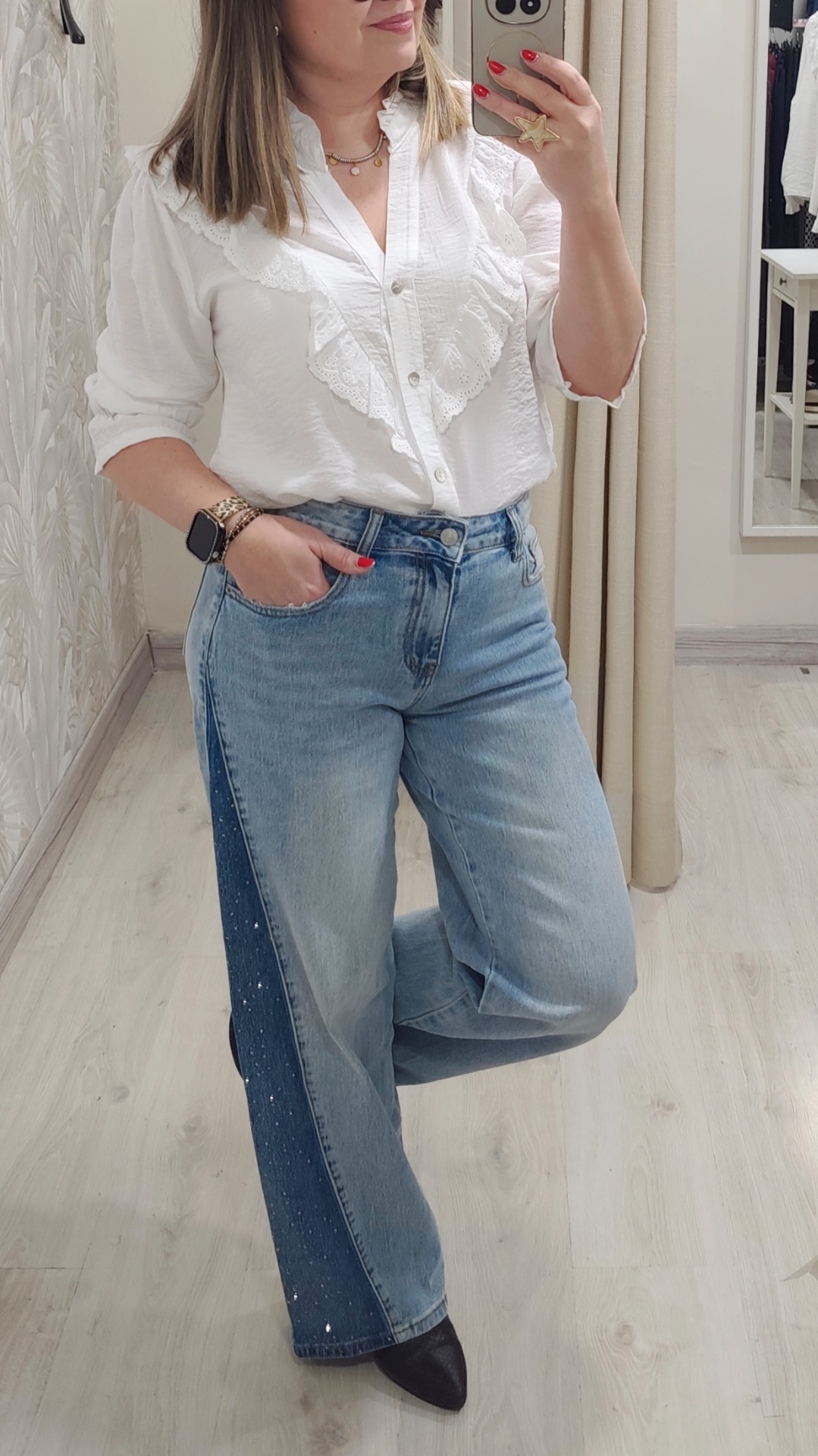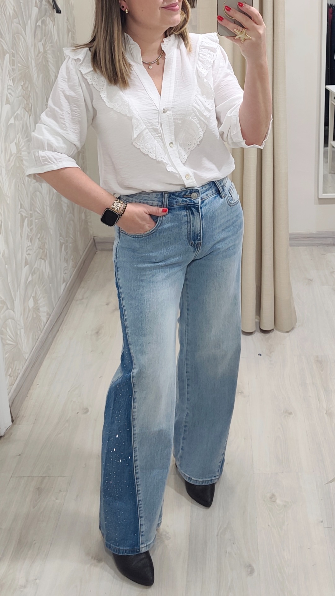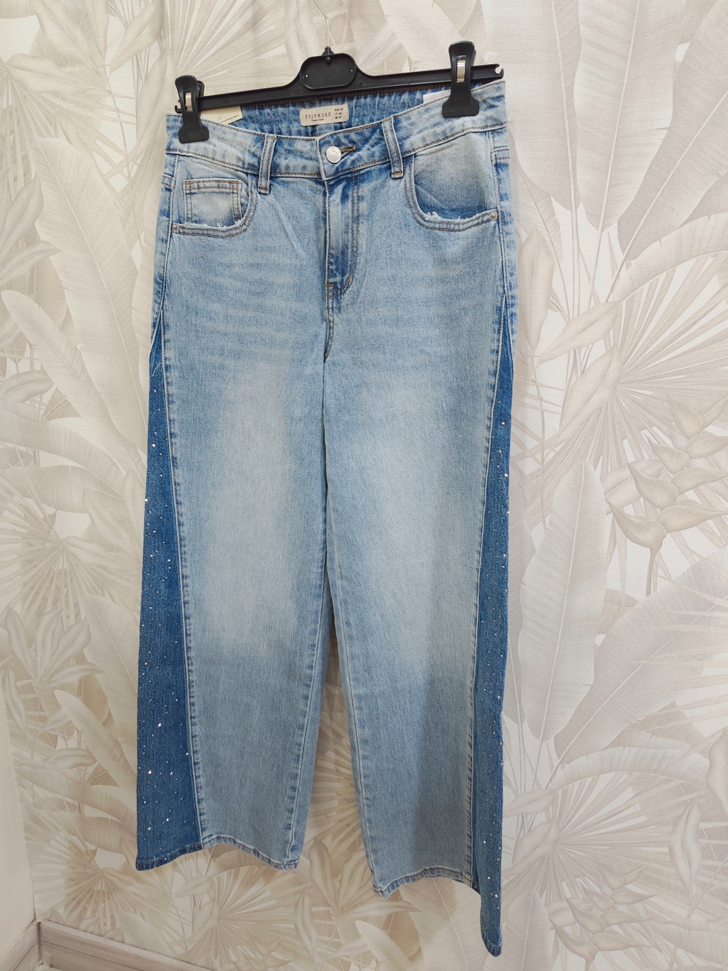 Vaquero corte ancho balloon con corte triangular y tachuelas de brillo